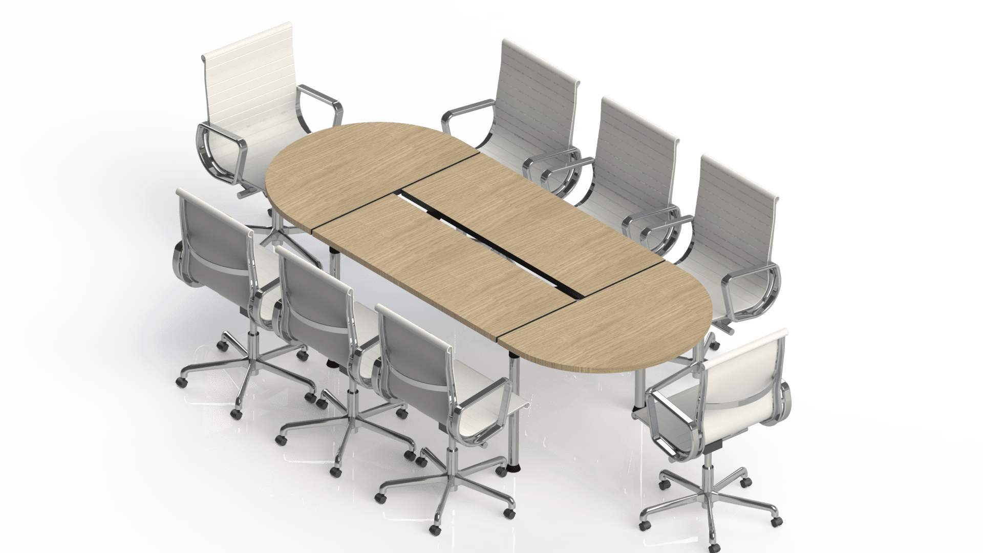 Superficie en tablex de 30 mm, enchapado en formica en colores planos o texturizados. Estructura metálica con acabados en pintura electrostática o herraje patas cromadas. Mesas inteligentes con PowerDock incorporado y canaleta para el paso de cables. (No incluye conexiones eléctricas)
